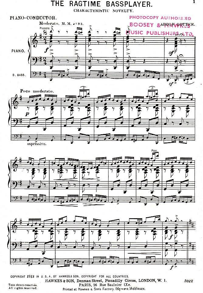 The fee of 10 pounds and 10 shillings in 1913 was a good one when a typical average annual income was only £51 (sterling). The piece’s title obviously changed between the two dates and was eventually published in 1913 by Hawkes & Son as The Ragtime Bassplayer.